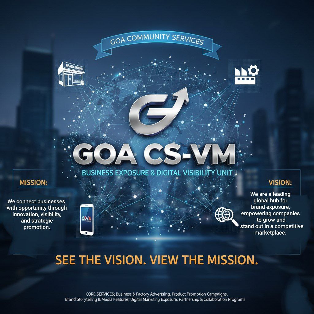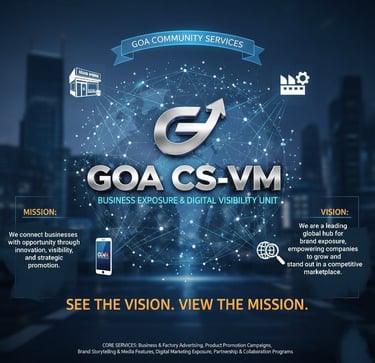 GOA CS-VM business exposure and visibility arm of GOA Community Services. Focuses on promoting shops, factories, brands, and companies through professional advertising, digital campaigns, and creative marketing strategies. The department serves as a gateway for enterprises to gain recognition, reach new audiences, and expand their market presence both locally and internationally.