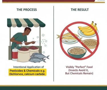 Each fruit, grain, or fish carries living enzymes—tiny biological workers that help break down nutrients and support digestion once eaten. When calcium-carbide gas, dichlorvos (Sniper®), or other industrial insecticides touch these foods, they oxidize and denature those enzymes. The food loses its natural ability to nourish.